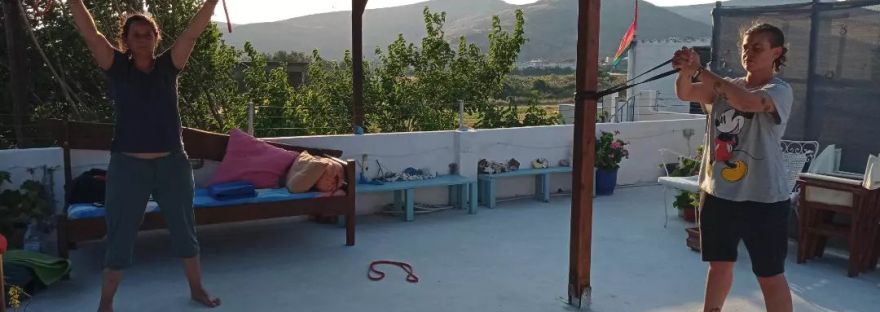Early evening group fitness classes on the rooftop in Skala Erresos, Lesvos This week a nice slower paced session to take into account the heat working on upperbody and core strength and stability and some mobility for the spine. TRX and Resistance band focused session - TRX inverted rows Band Pull Aparts Paloff Press Band… Continue reading Group Fitness Classes